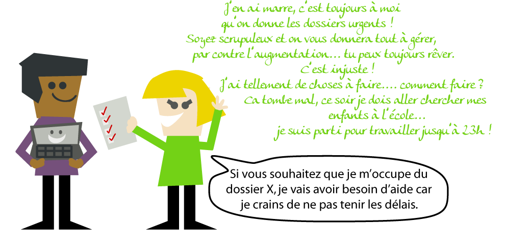 Ou encore, lorsque votre patron vous demande de prendre un dossier et que vous allez le voir pour une revendication : avez-vous une demande à lui adresser ? Avez-vous peur de ne pas y arriver ? Avez-vous un point de vue différent du sien sur la manière de traiter le sujet ?